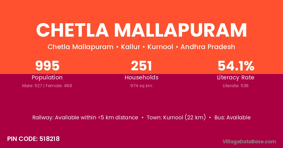Kurnool (22 km) is the nearest town to Chetla Mallapuram village for major economic activities and is located approximately 22 km away.