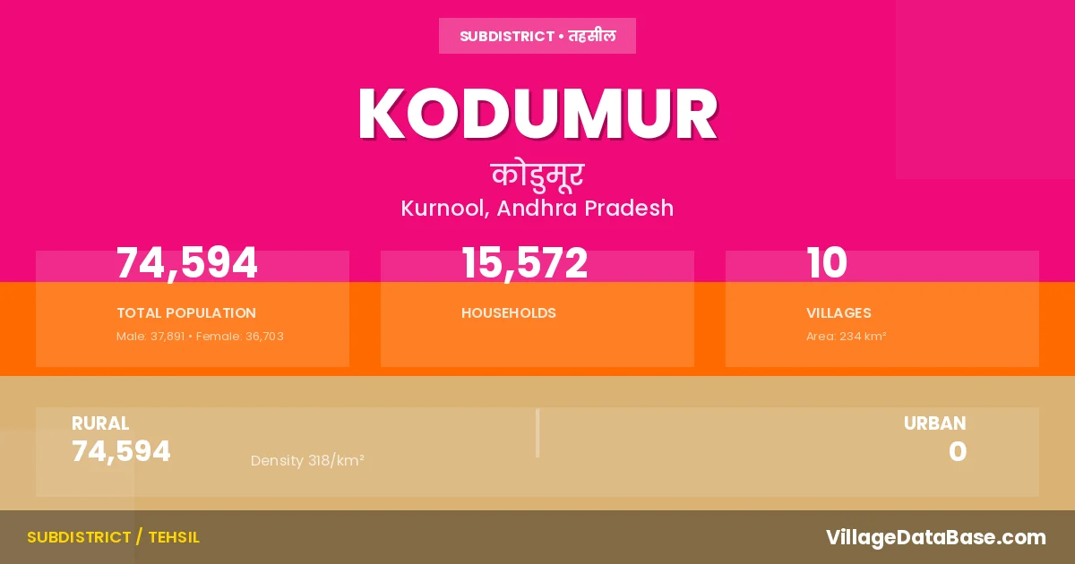 According to the 2011 census The total area of Kodumur Mandal is 234 km², with a population of 74594 people. The population density is 318 inhabitants per square kilometre, and there are approximately 15572 houses in the sub district.