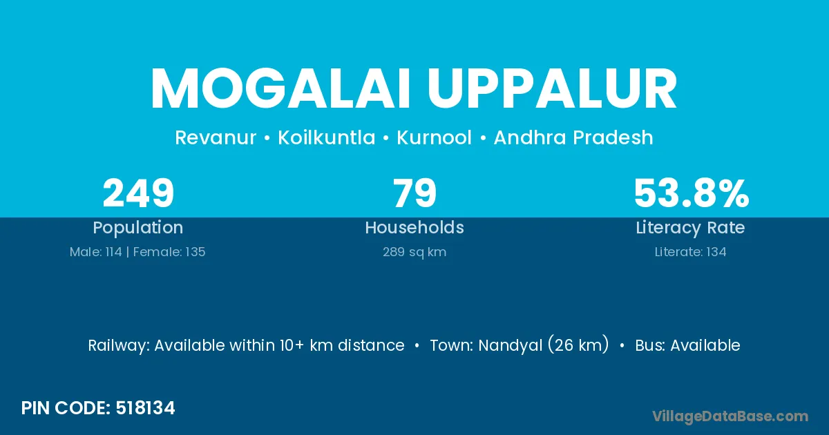 Nandyal (26 km) is the nearest town to Mogalai Uppalur village for major economic activities and is located approximately 26 km away.