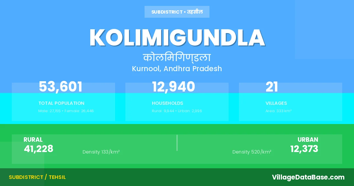 According to the 2011 census The total area of Kolimigundla Mandal is 333 km², with a population of 53601 people. The population density is 161 inhabitants per square kilometre, and there are approximately 12940 houses in the sub district.