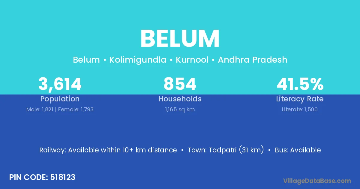 Tadpatri (31 km) is the nearest town to Belum village for major economic activities and is located approximately 31 km away.