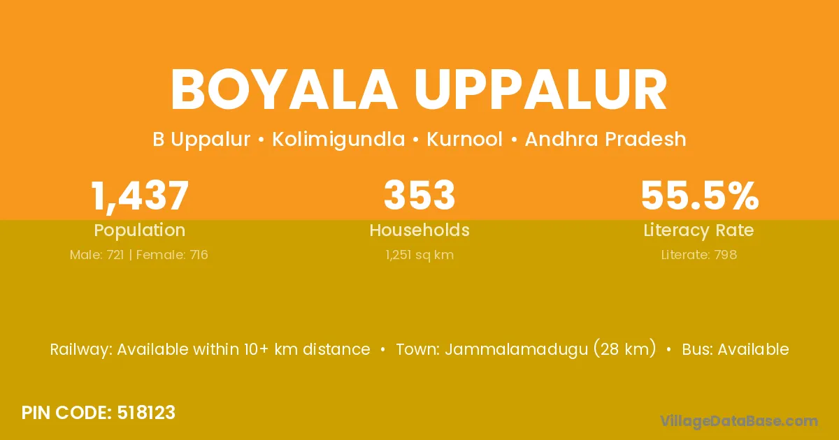 Boyala Uppalur village has a total population of 1,437 people, of which 721 are males and 716 are females.