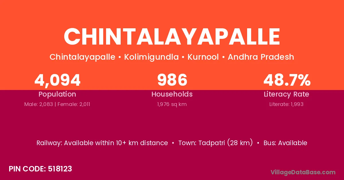 Tadpatri (28 km) is the nearest town to Chintalayapalle village for major economic activities and is located approximately 28 km away.