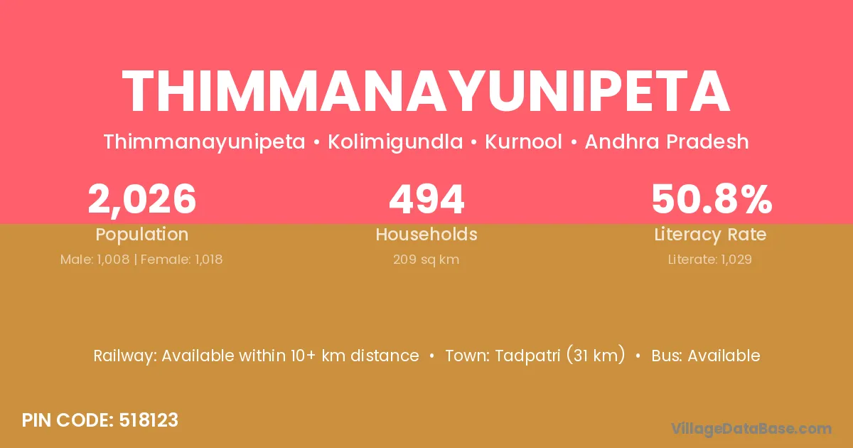 Thimmanayunipeta village has a total population of 2,026 people, of which 1,008 are males and 1,018 are females.