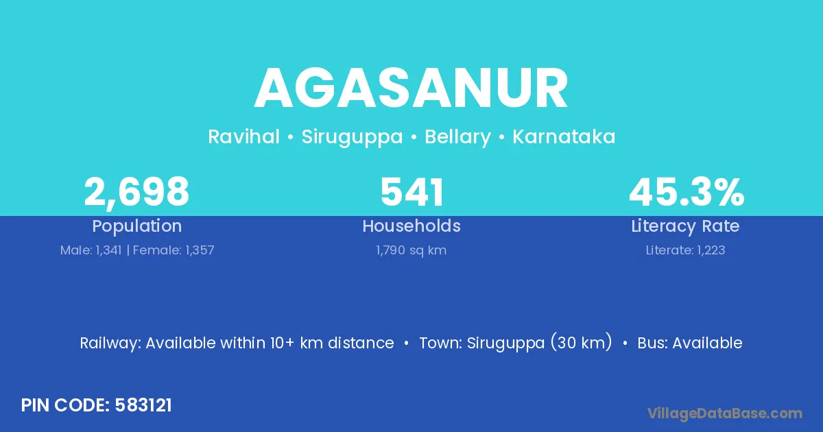 Adoni (48 km) is the nearest town to Agasanur village for major economic activities and is located approximately 48 km away.