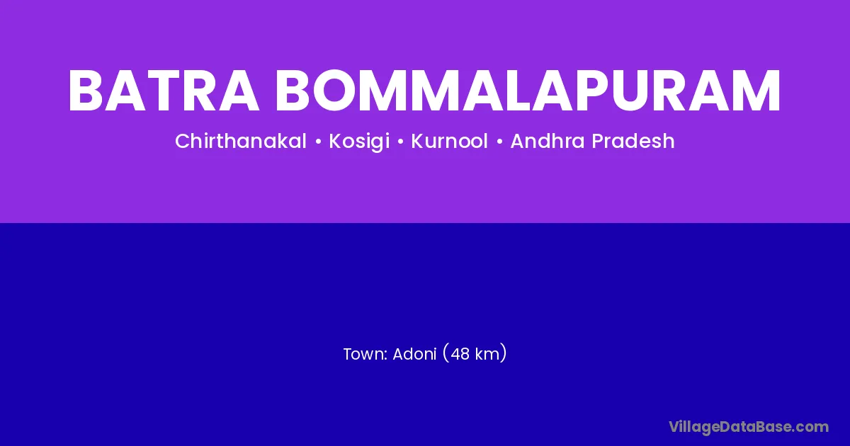Adoni (48 km) is the nearest town to Batra Bommalapuram village for major economic activities and is located approximately 48 km away.