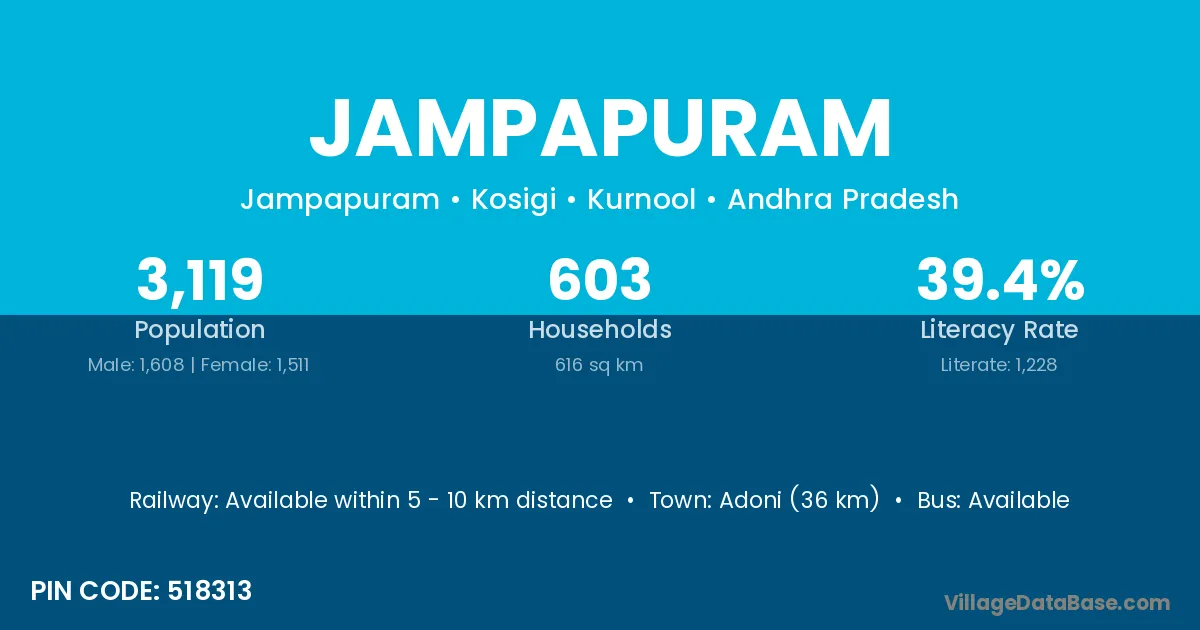 Adoni (36 km) is the nearest town to Jampapuram village for major economic activities and is located approximately 36 km away.