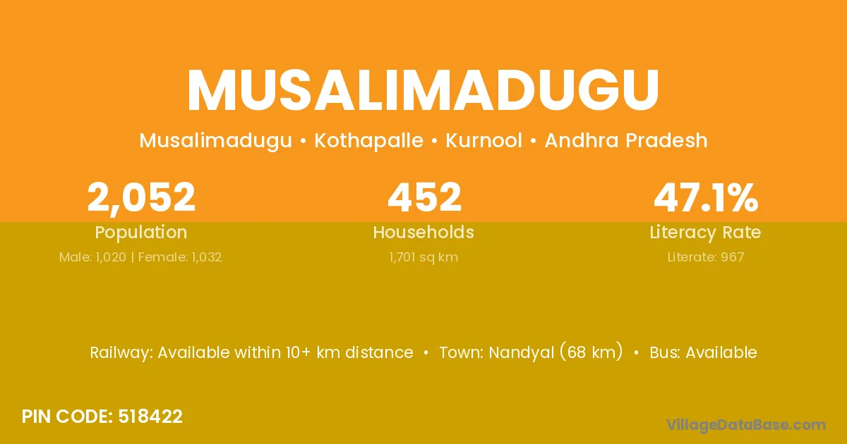 Musalimadugu village has a total population of 2,052 people, of which 1,020 are males and 1,032 are females.