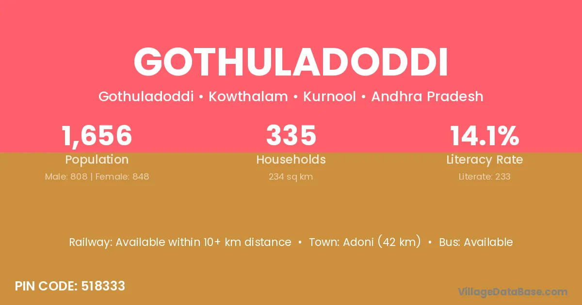 Adoni (42 km) is the nearest town to Gothuladoddi village for major economic activities and is located approximately 42 km away.