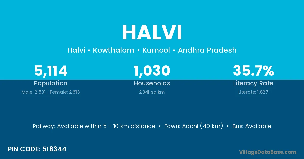 Adoni (40 km) is the nearest town to Halvi village for major economic activities and is located approximately 40 km away.