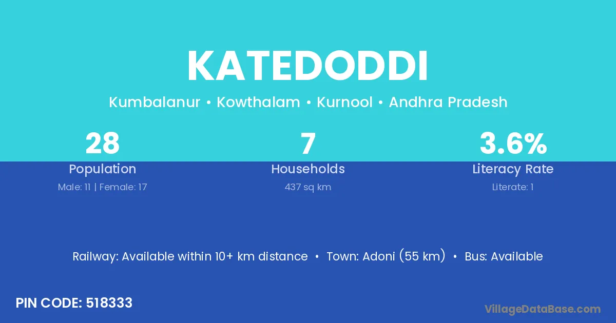 The literacy rate of Katedoddi village is 3.57%. Male literacy stands at 9.09% and female literacy at 0.00%.