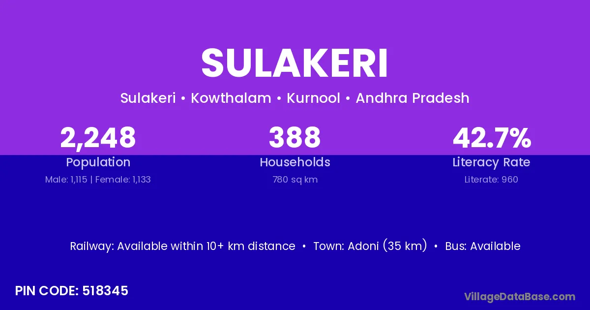 Adoni (35 km) is the nearest town to Sulakeri village for major economic activities and is located approximately 35 km away.