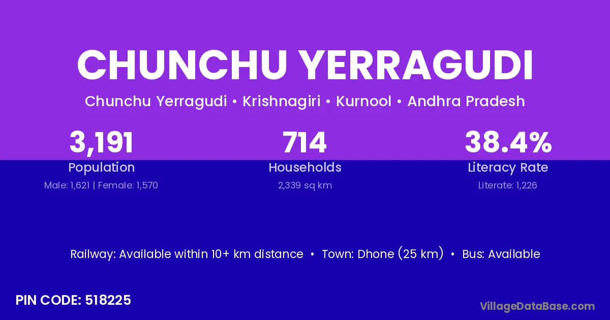 Dhone (25 km) is the nearest town to Chunchu Yerragudi village for major economic activities and is located approximately 25 km away.