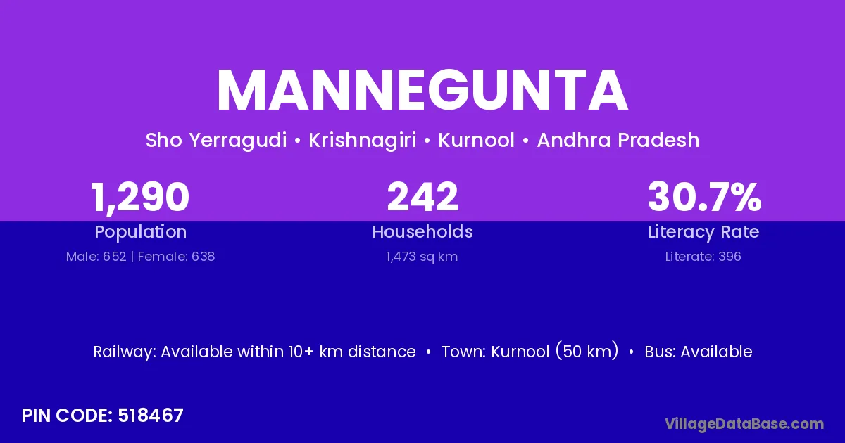 Kurnool (50 km) is the nearest town to Mannegunta village for major economic activities and is located approximately 50 km away.
