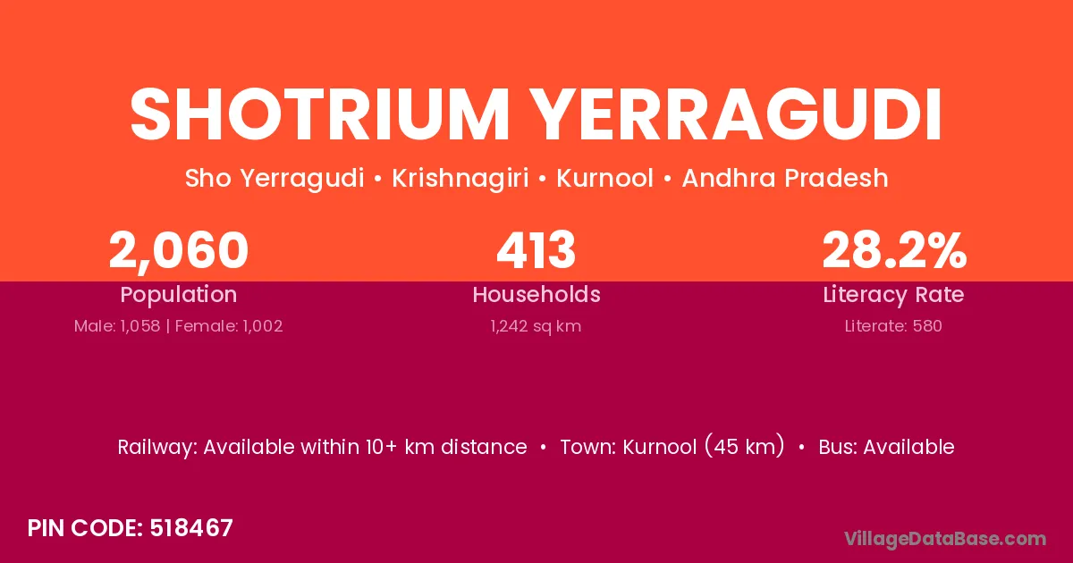 Shotrium Yerragudi village has a total population of 2,060 people, of which 1,058 are males and 1,002 are females.