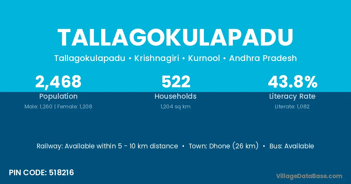 Dhone (26 km) is the nearest town to Tallagokulapadu village for major economic activities and is located approximately 26 km away.
