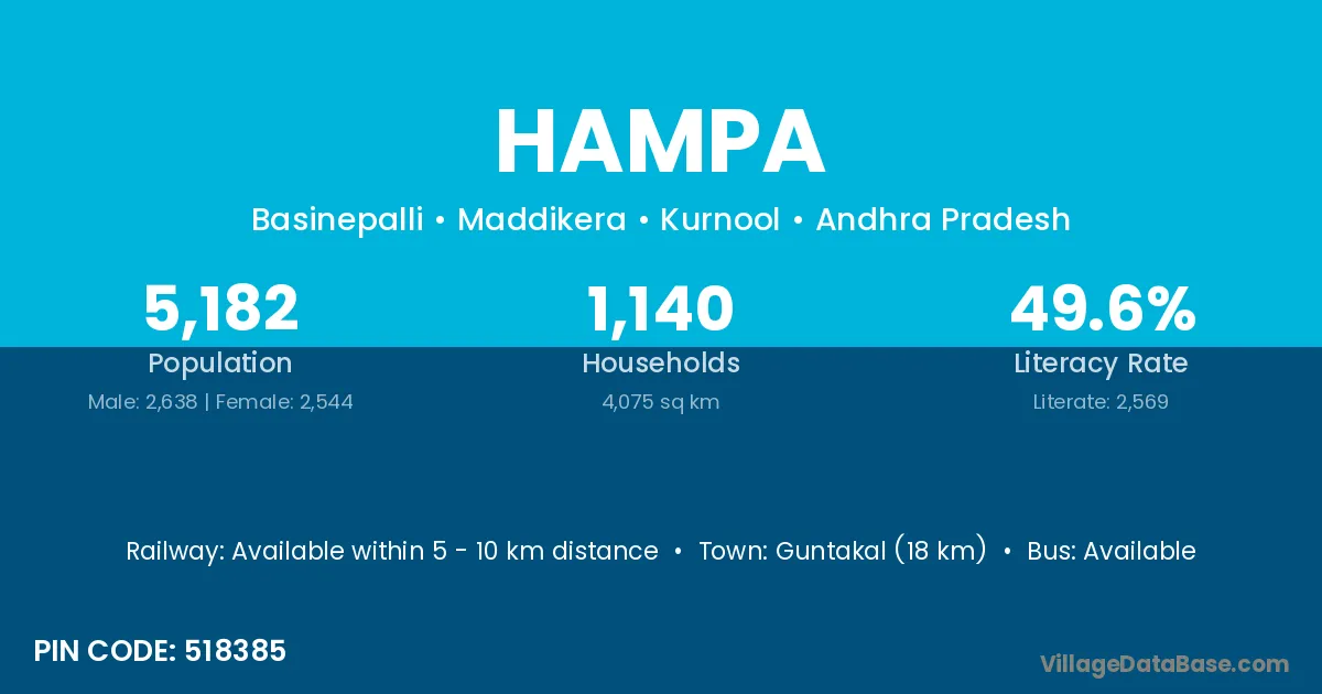 Guntakal (18 km) is the nearest town to Hampa village for major economic activities and is located approximately 18 km away.