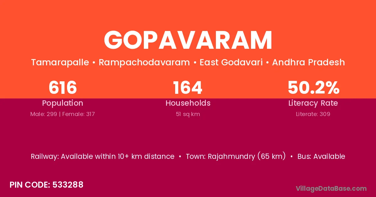 The literacy rate of Gopavaram village is 53.00%. Male literacy stands at 63.35% and female literacy at 42.10%.