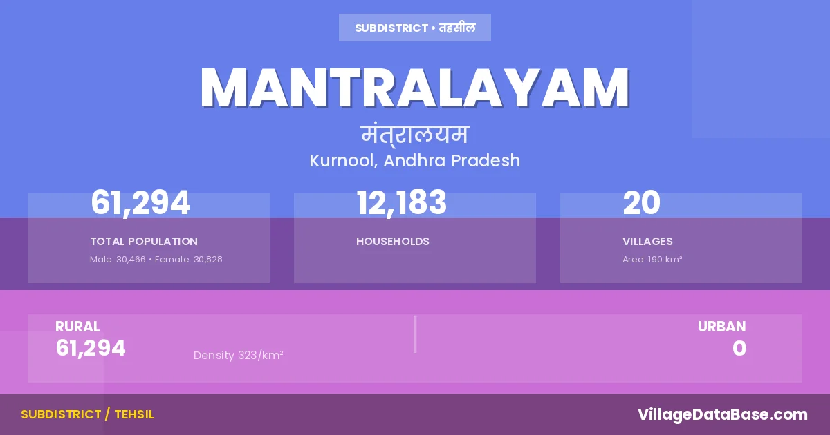 According to the 2011 census The total area of Mantralayam Mandal is 190 km², with a population of 61294 people. The population density is 323 inhabitants per square kilometre, and there are approximately 12183 houses in the sub district.