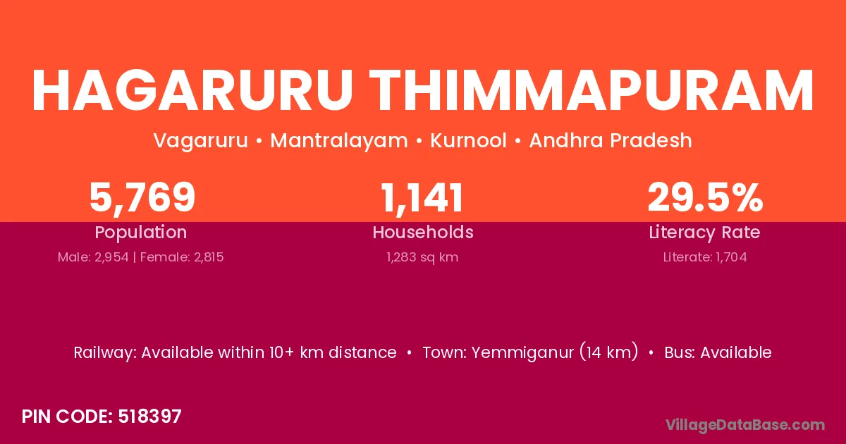 Hagaruru Thimmapuram village has a total population of 5,769 people, of which 2,954 are males and 2,815 are females.
