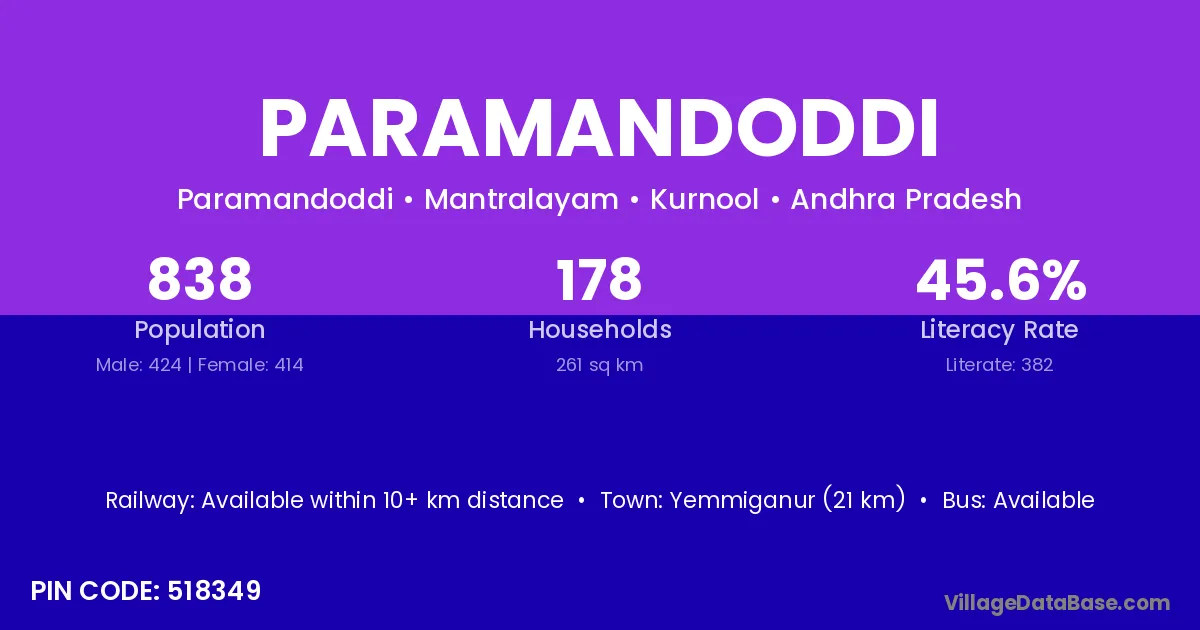 Paramandoddi village has a total population of 838 people, of which 424 are males and 414 are females.