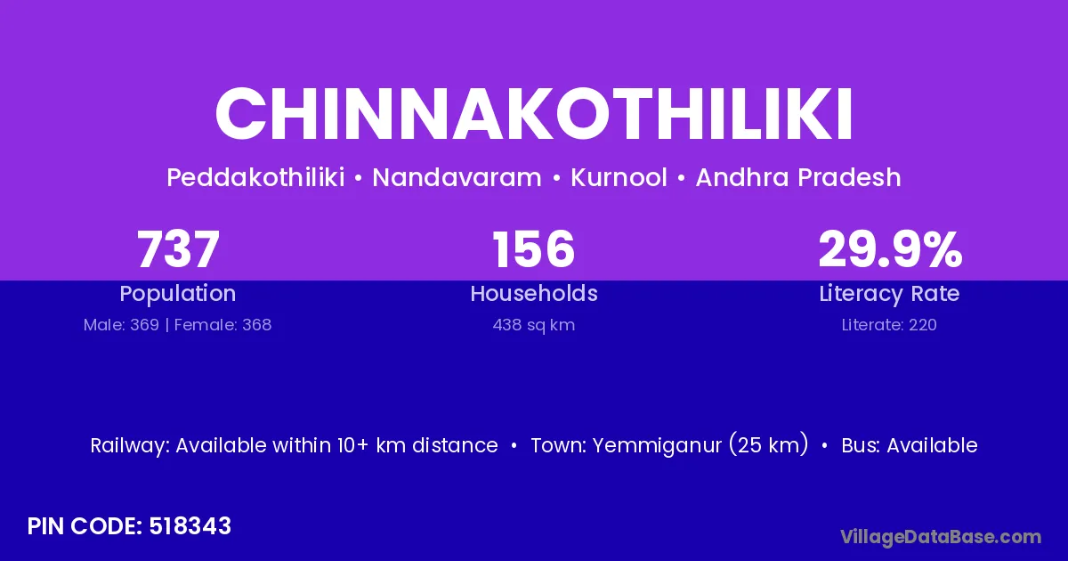 Chinnakothiliki village has a total population of 737 people, of which 369 are males and 368 are females.