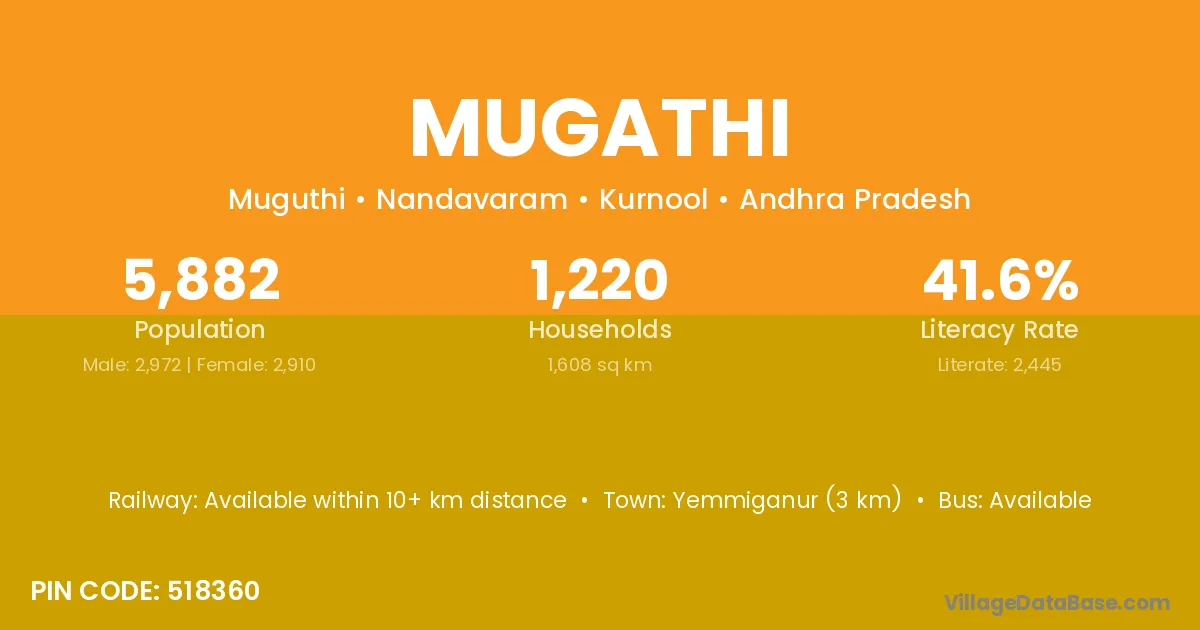 Mugathi village has a total population of 5,882 people, of which 2,972 are males and 2,910 are females.