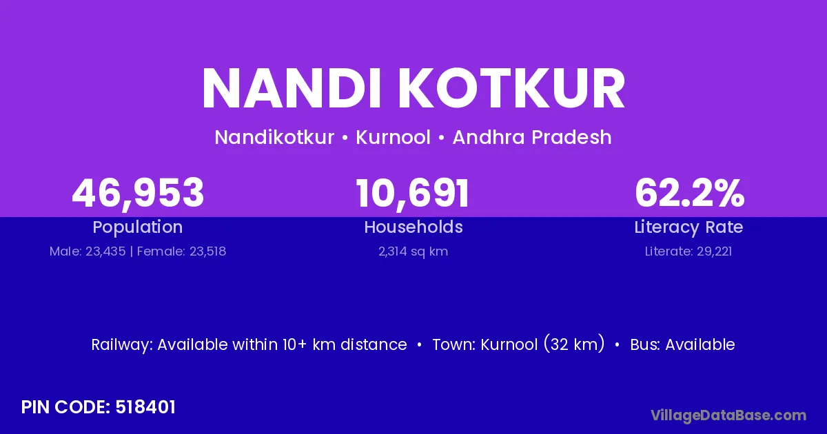 Kurnool (32 km) is the nearest town to Nandi Kotkur village for major economic activities and is located approximately 32 km away.
