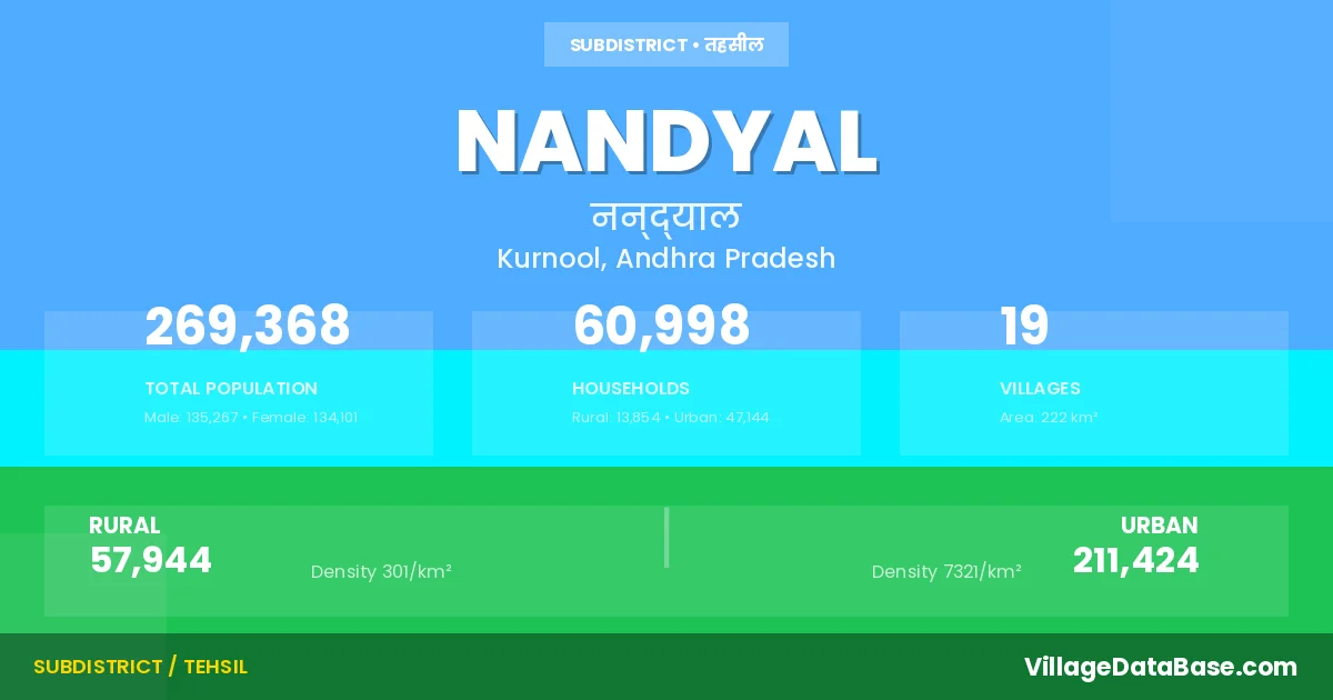 According to the 2011 census The total area of Nandyal Mandal is 222 km², with a population of 269368 people. The population density is 1,216 inhabitants per square kilometre, and there are approximately 60998 houses in the sub district.