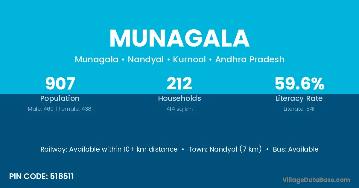 Munagala village has a total population of 907 people, of which 469 are males and 438 are females.