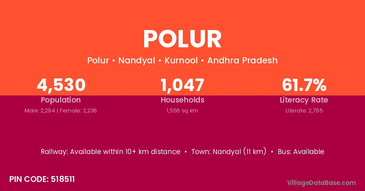 Nandyal (11 km) is the nearest town to Polur village for major economic activities and is located approximately 11 km away.