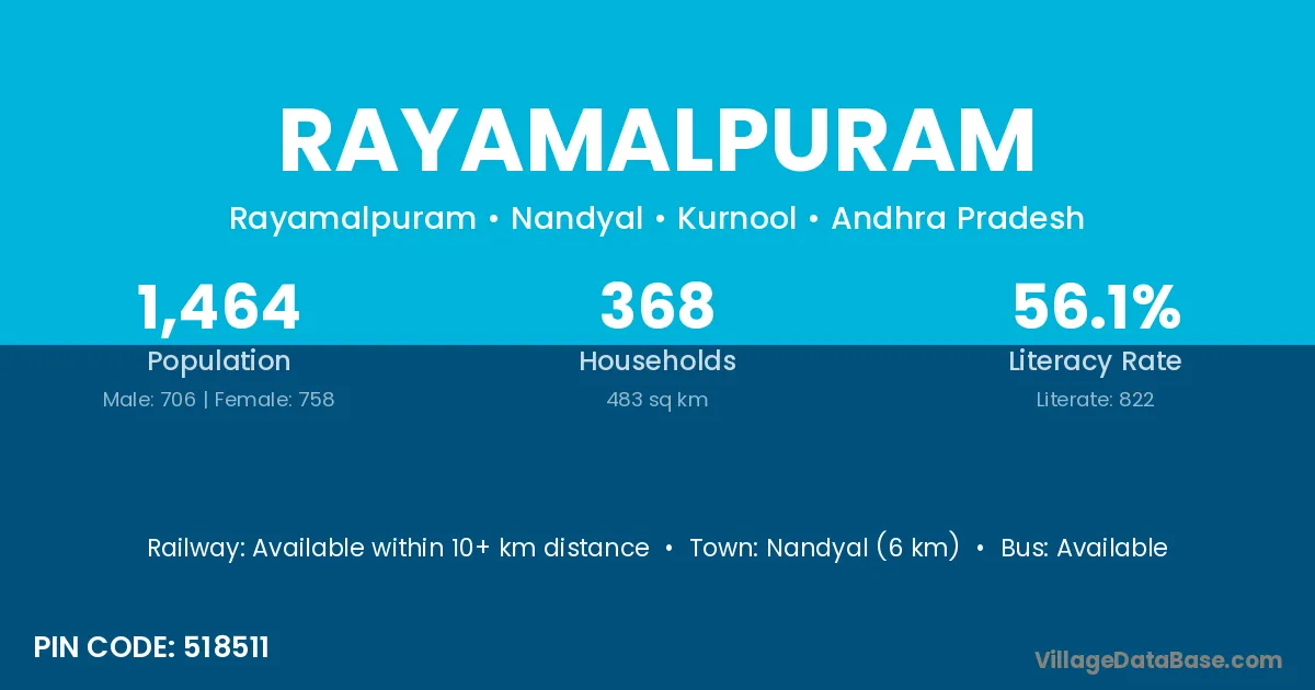 Nandyal (6 km) is the nearest town to Rayamalpuram village for major economic activities and is located approximately 6 km away.