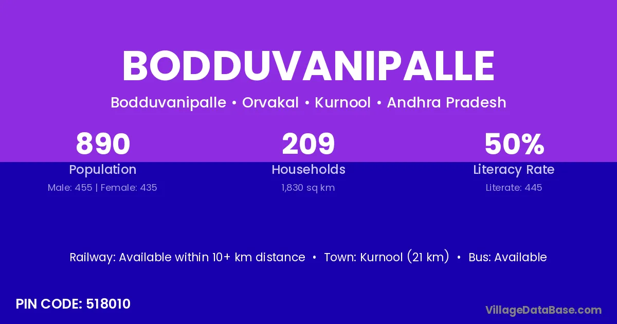 Kurnool (21 km) is the nearest town to Bodduvanipalle village for major economic activities and is located approximately 21 km away.