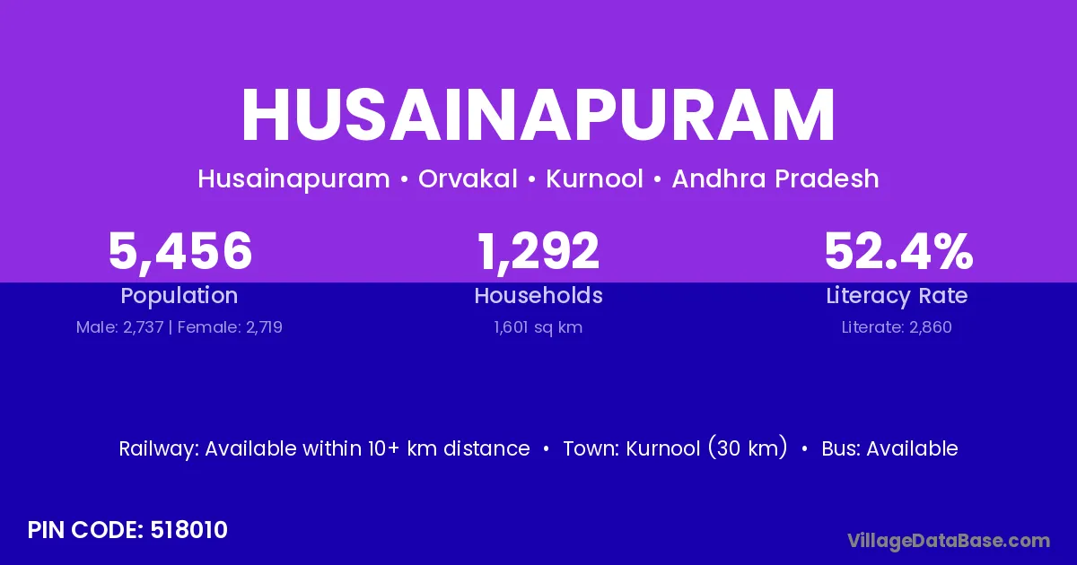 Kurnool (30 km) is the nearest town to Husainapuram village for major economic activities and is located approximately 30 km away.