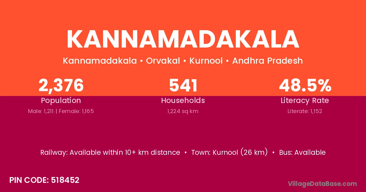 Kannamadakala village has a total population of 2,376 people, of which 1,211 are males and 1,165 are females.