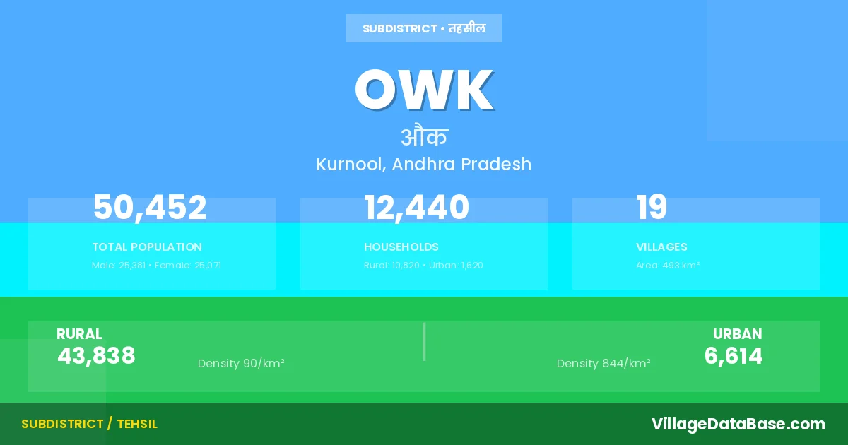 According to the 2011 census The total area of Owk Mandal is 493 km², with a population of 50452 people. The population density is 102 inhabitants per square kilometre, and there are approximately 12440 houses in the sub district.