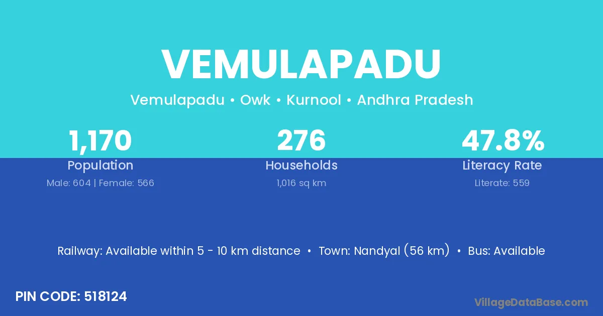 Nandyal (56 km) is the nearest town to Vemulapadu village for major economic activities and is located approximately 56 km away.