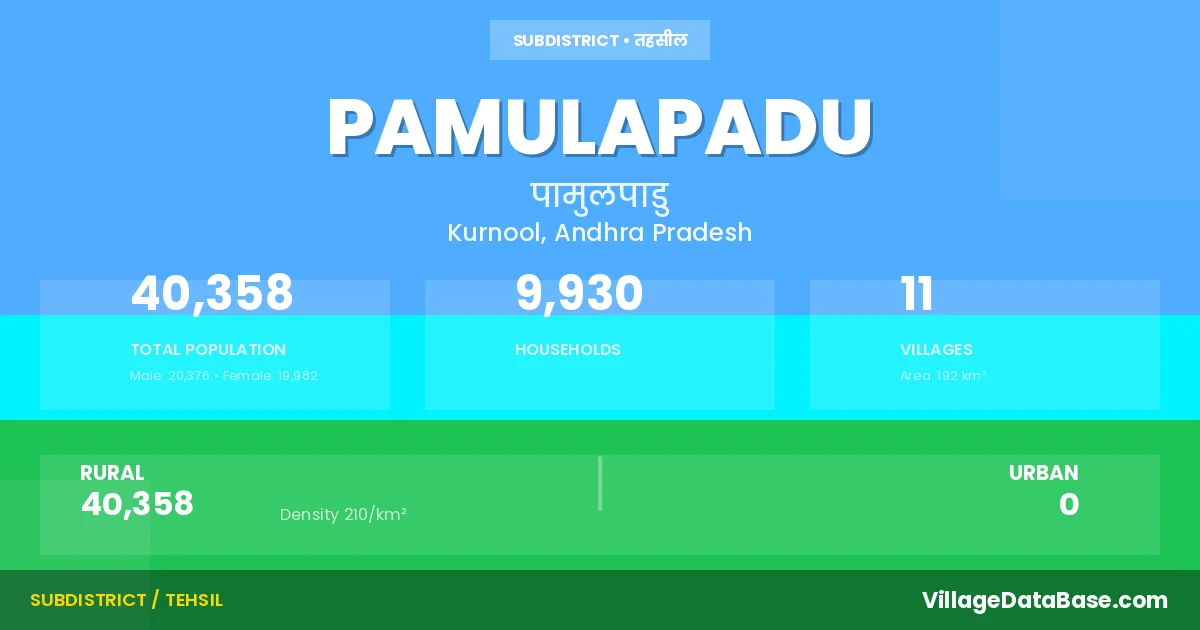 According to the 2011 census The total area of Pamulapadu Mandal is 192 km², with a population of 40358 people. The population density is 210 inhabitants per square kilometre, and there are approximately 9930 houses in the sub district.