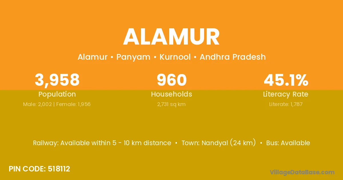 Nandyal (24 km) is the nearest town to Alamur village for major economic activities and is located approximately 24 km away.