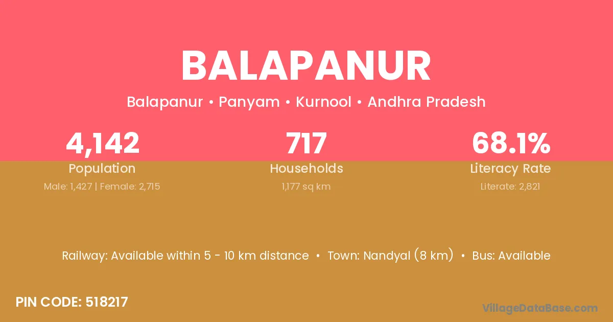 Nandyal (8 km) is the nearest town to Balapanur village for major economic activities and is located approximately 8 km away.