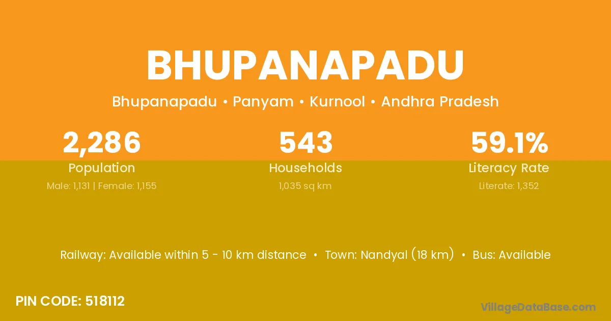 Nandyal (18 km) is the nearest town to Bhupanapadu village for major economic activities and is located approximately 18 km away.