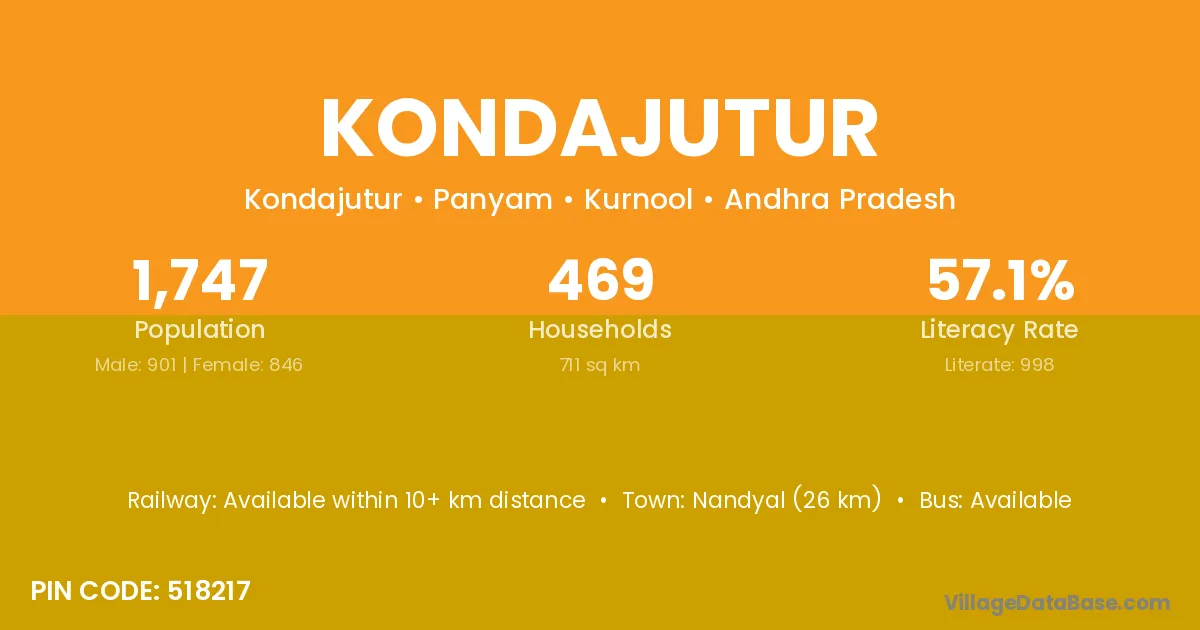 Nandyal (26 km) is the nearest town to Kondajutur village for major economic activities and is located approximately 26 km away.
