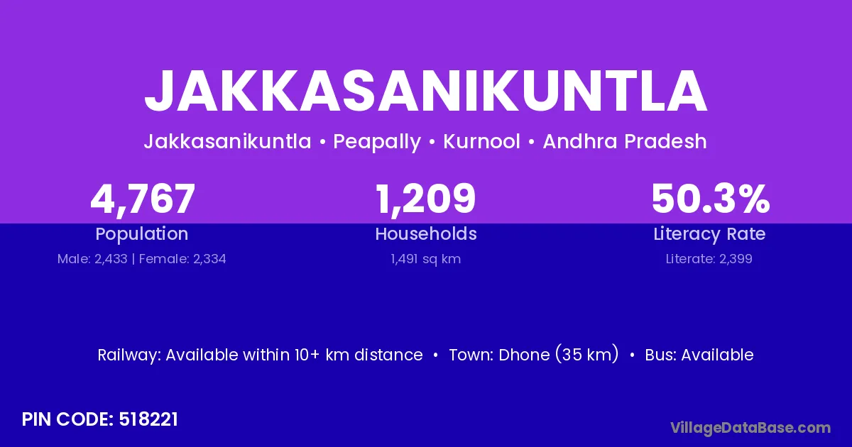 Dhone (35 km) is the nearest town to Jakkasanikuntla village for major economic activities and is located approximately 35 km away.