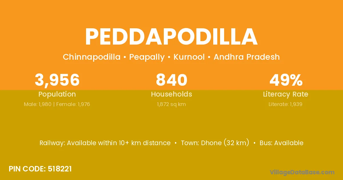 Dhone (32 km) is the nearest town to Peddapodilla village for major economic activities and is located approximately 32 km away.