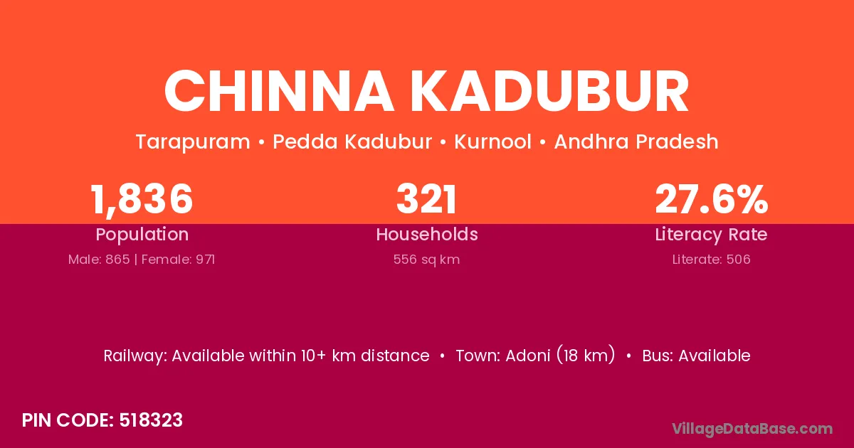 Adoni (18 km) is the nearest town to Chinna Kadubur village for major economic activities and is located approximately 18 km away.