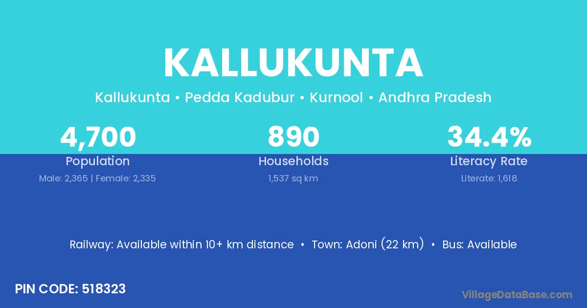 Adoni (22 km) is the nearest town to Kallukunta village for major economic activities and is located approximately 22 km away.