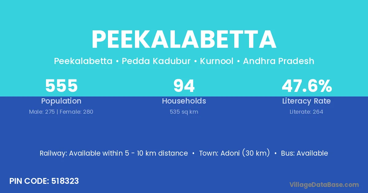 Adoni (30 km) is the nearest town to Peekalabetta village for major economic activities and is located approximately 30 km away.