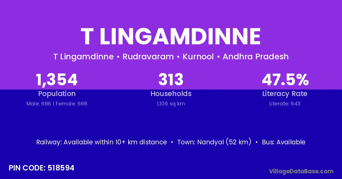 Nandyal (52 km) is the nearest town to T Lingamdinne village for major economic activities and is located approximately 52 km away.