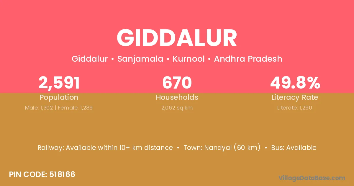Nandyal (60 km) is the nearest town to Giddalur village for major economic activities and is located approximately 60 km away.