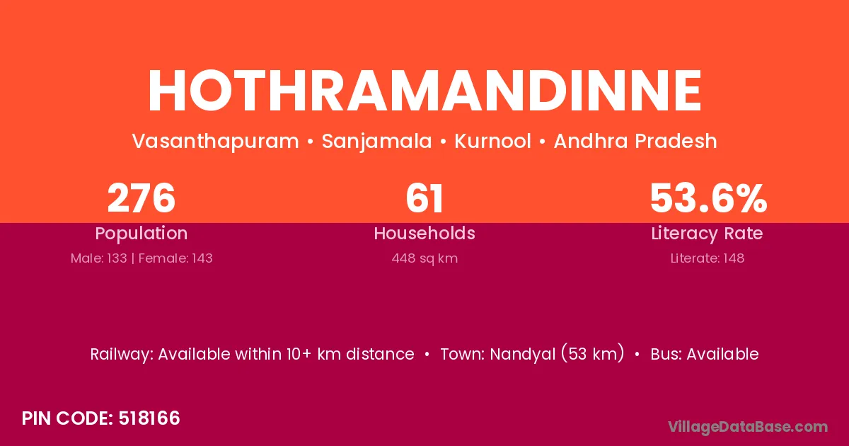 Nandyal (53 km) is the nearest town to Hothramandinne village for major economic activities and is located approximately 53 km away.